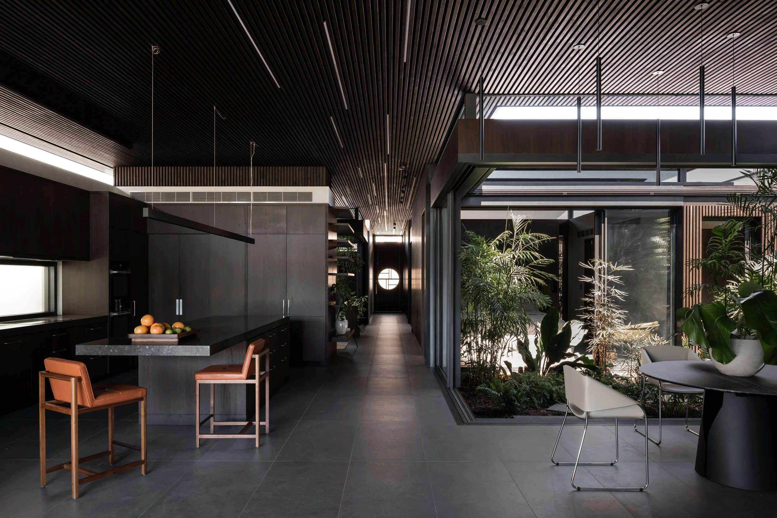Internal courtyards provide natural light and cooling breezes while greenery connects the owners to nature.