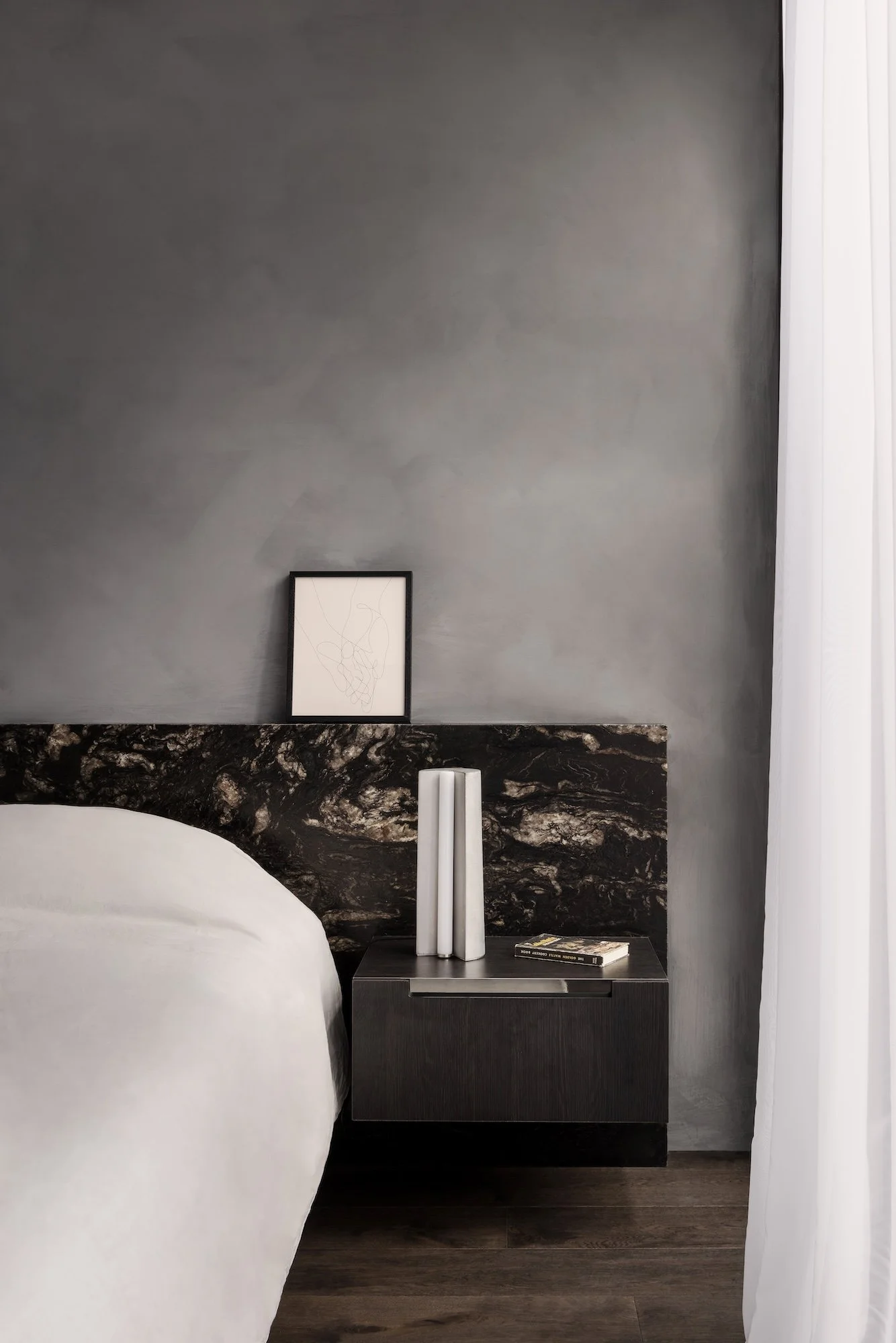 In the master bedroom, leather finished titanium granite forms the bedhead, providing a stunning backdrop for a Tableton lamp by Volker Haug and an artwork by Clément Legrand.