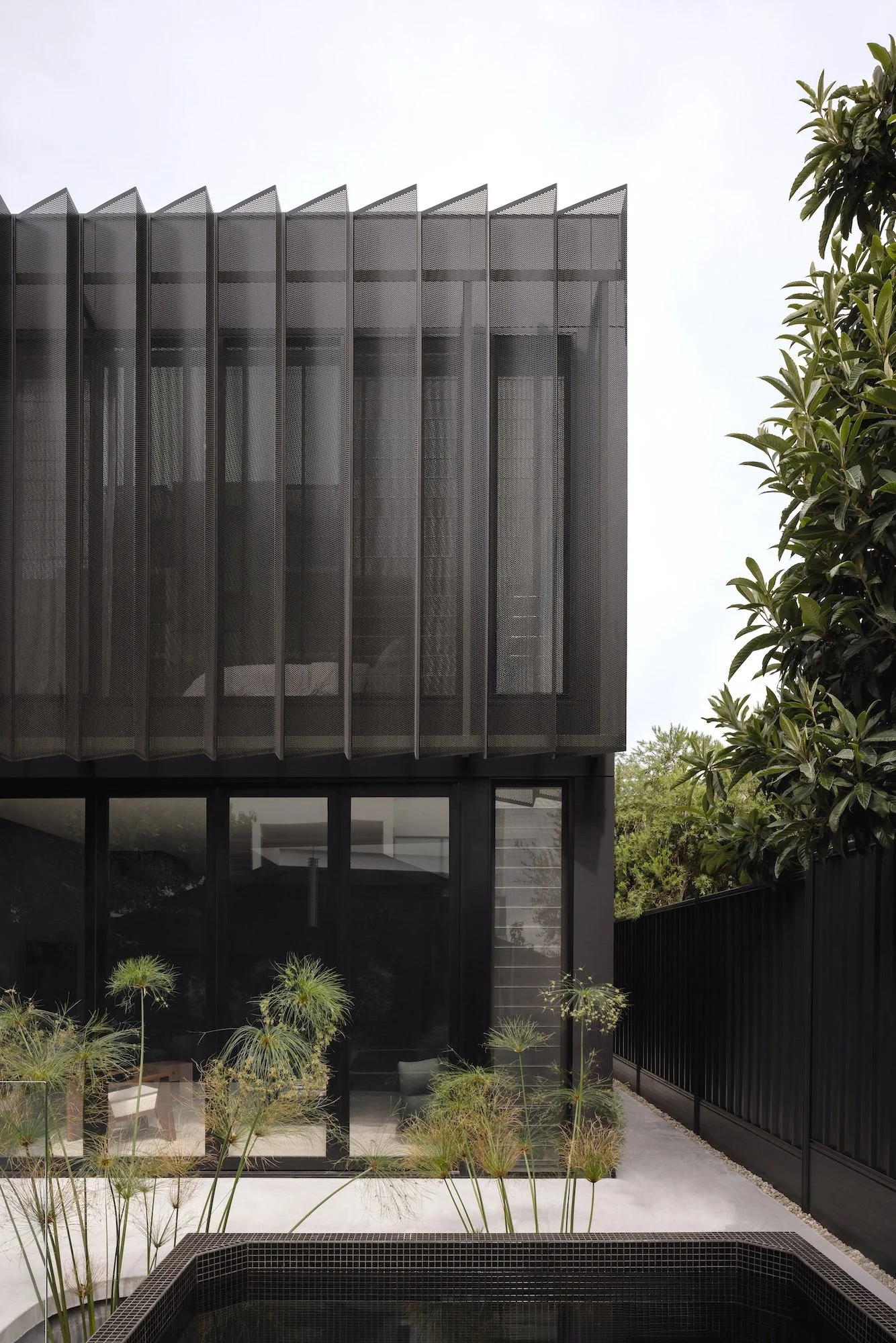Dramatic black powder coat screens mask Ben’s bedroom that hovers over the house, filtering in the sunlight from the east.