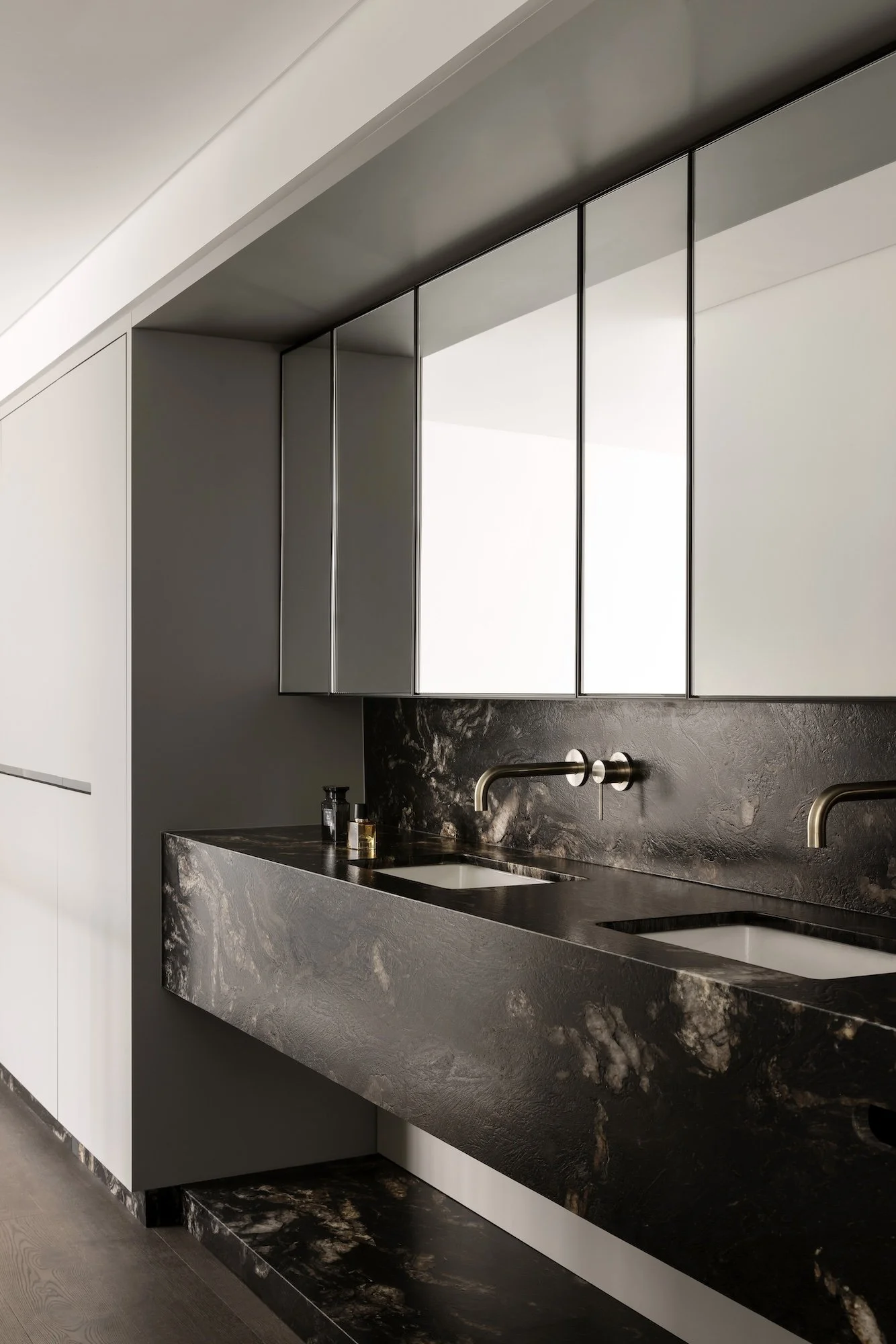 “It’s designed like a hotel suite with a strong masculine aesthetic,” says Nickolas. “It’s dark and moody, with lots of angles and a rich, dark materiality. The natural light that comes in contributes to a beautiful interplay of darkness and light.”