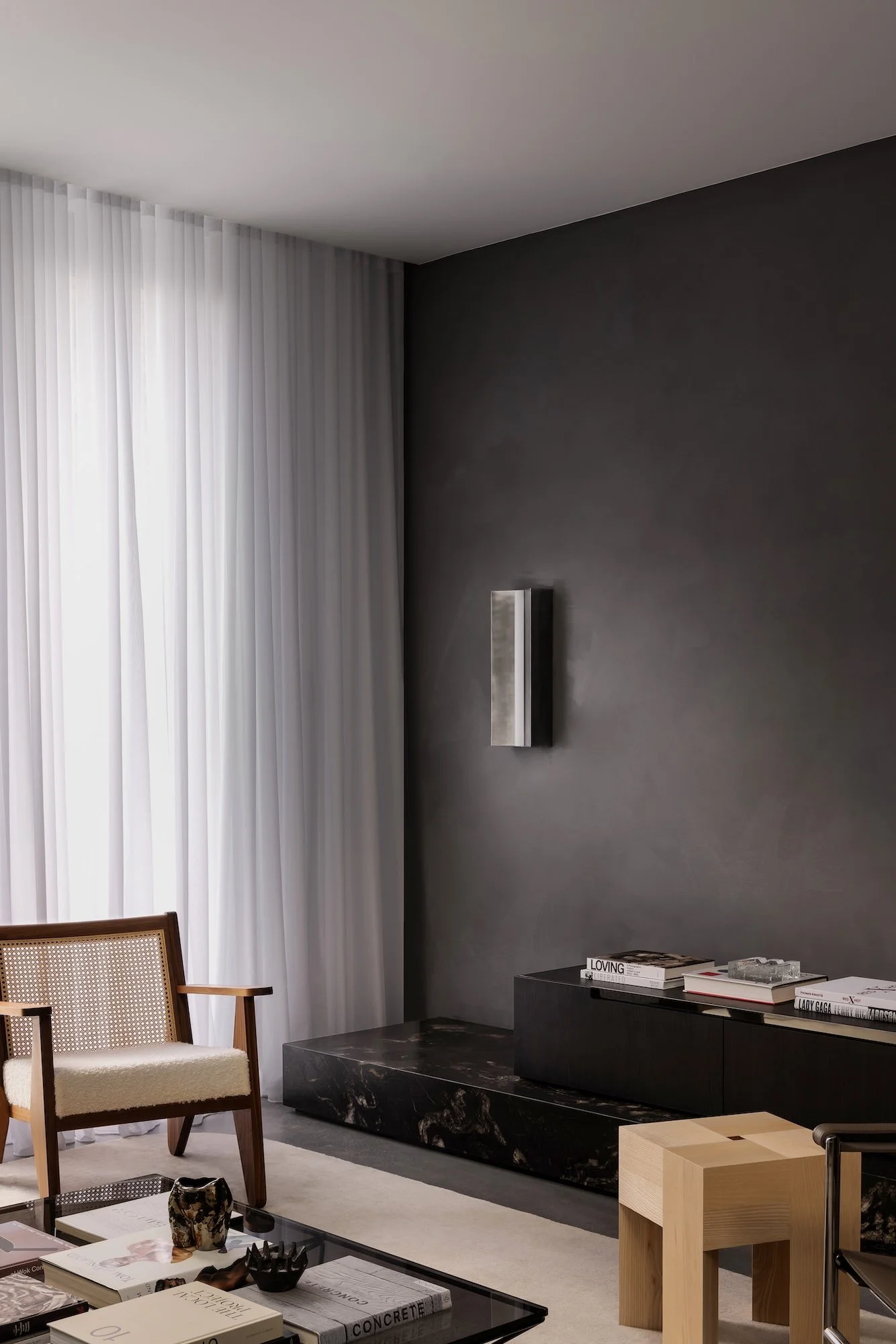 The living space off the kitchen includes a stunning stone plinth and Triangle stool by Karakter from Cult Design.